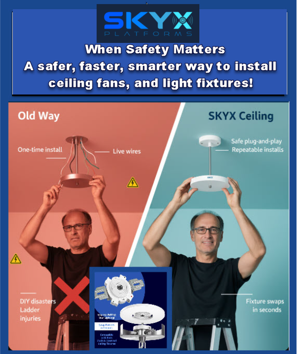 The CPSC meeting log is especially telling. SKYX showed videos of its installation process and told staff that the system reduces time on ladders, reduces electrical hazards, and improves the mechanical security of installed fans and fixtures. That matters because ladder falls remain one of the most common and serious jobsite hazards, especially in overhead trades.