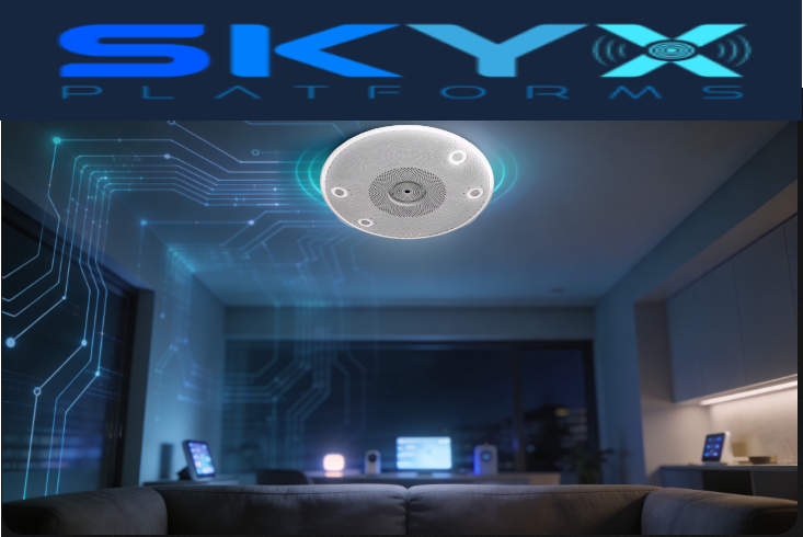 The SKYX smart hub sits at the highest point in the room — the ideal position for microphones and speakers. No counter space. No visible cords. No separate install once the plug‑and‑play ceiling outlet is in.